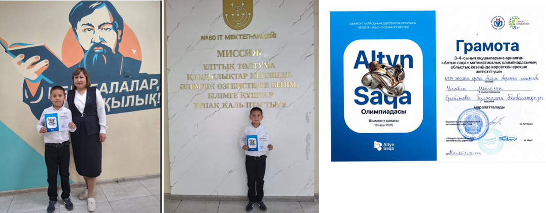 Шымкент қаласы білім басқармасының Әдістемелік орталығы "Зерделі" ақыл-ой дамыту орталығымен бірлесе отырып 3-4-сынып оқушыларына арналған математика пәнінен "Алтын Сақа" олимпиадасының облыстық кезеңінің 2025 жылғы 18-сәуір күні №69 жалпы орта білім беретін мектебі базасында өткізді. Ақтық кезеңде Шымкент қаласының білім беру ұйымдарынан қатысқан 230 оқушының ішінен олимпиада нәтижесіне сай мектебіміздің 4 “А”-сынып оқушысы Исабек Мейірлан мақтау қағазымен МАРАПАТТАЛДЫ. Жетекшісі Ерсейітова Гүлжахан апайға алғыс айтамыз.