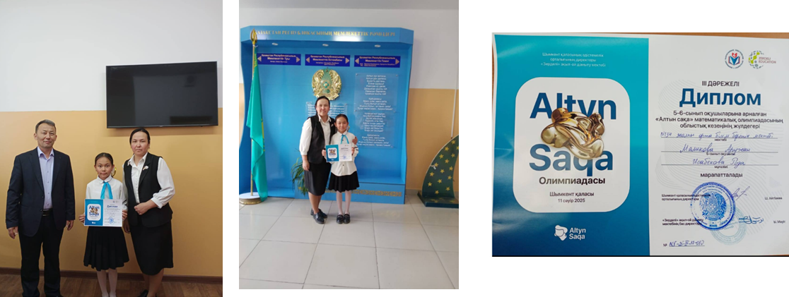 Шымкент қаласы білім басқармасының Әдістемелік орталығы "Зерделі" ақыл-ой дамыту орталығымен бірлесе отырып 5-6- сынып оқушыларына арналған математика пәнінен "Алтын Сақа" олимпиадасының облыстық кезеңінің 2025 жылғы 11- сәуір күні №69 жалпы орта білім беретін мектебі базасында өткізді. Ақтық кезеңде Шымкент қаласының білім беру ұйымдарынан қатысқан 230 оқушының ішінен олимпиада нәтижесіне сай мектебіміздің 5А- сынып оқушысы Маликова Аружан III-дәрежелі дипломмен