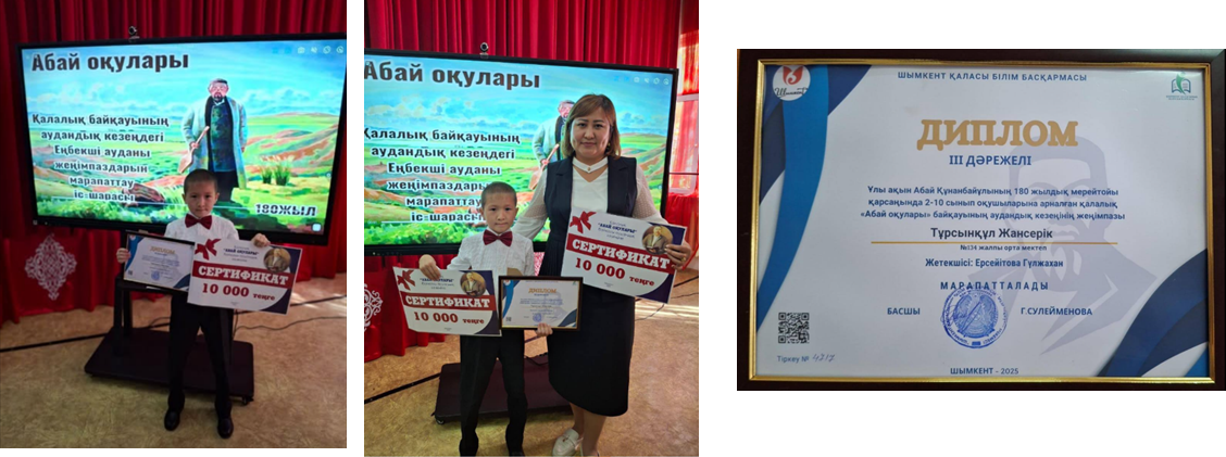 Салтанатты марапаттау рәсімінде Еңбекші ауданы бойынша жеңімпаз атанған оқушымыз Жансерікке және оның жетекшісіне Ерсейітова Гүлжаханға арнайы диплом мен бағалы сертификаттар табысталды.