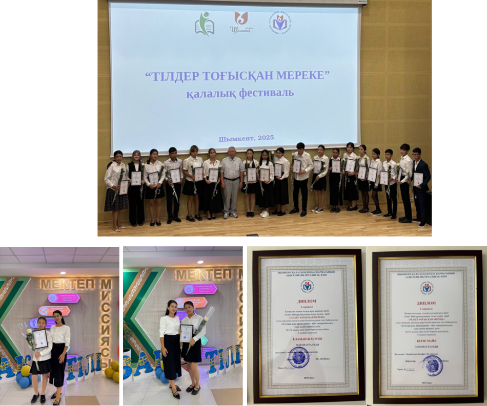 Шымкент қаласы Әдістемелік орталығының жылдық жұмыс жоспары негізінде, "5 қыркүйек - Қазақстан халқы тілдері күні" мерекесі қарсаңында Ахмет Байтұрсынұлының рухани мұрасын насихаттау арқылы мемлекеттік тілдің мәртебесін арттыру, этносаралық келісімді, патриотизм мен мәдени тұтастықты нығайту мақсатында,2025 жылдың 3 қыркүйек күні 8-10 сыныптар арасында "Ұлттың ұлы құндылығы - тіл" атты қалалық эссе байқауына оқушыларымыз қатысып І дәрежелі дипломмен марапатталды. Берік Мая 8 "Б" сынып оқушысы. Жетекшісі: Ордабекова Дилафруз Кулобиевна. 9 "А" сынып оқушысы Еламан Жасмин. Жетекшісі: Утенбаева Динара Сейтказимовна! Марапаттарыңыз құтты болсын!