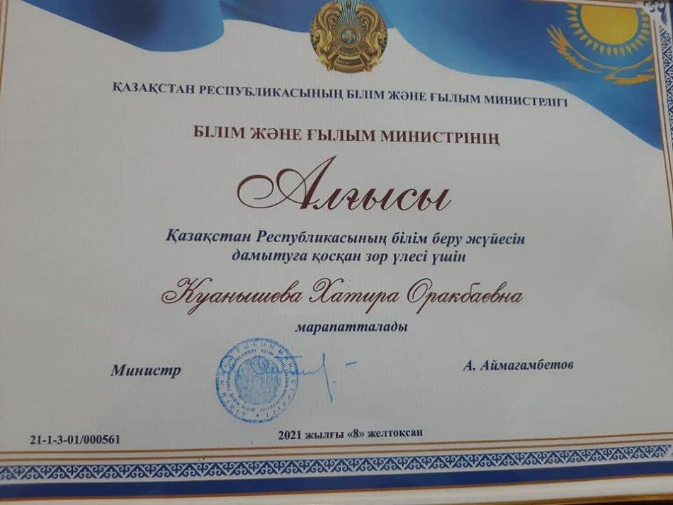 Шымкент қаласы білім басқармасына қарасты №134 жалпы орта білім беретін мектебінің география пәні мұғалімі ҚУАНЫШЕВА ХАТИРА ОРАКБАЕВНА Қазақстан Республикасының білім беру жүйесін дамытуға қосқан зор үлесі үшін БІЛІМ ЖӘНЕ ҒЫЛЫМ МИНИСТРІ А.АЙМАҒАМБЕТОВТЫҢ алғыс хатымен марапатталды.