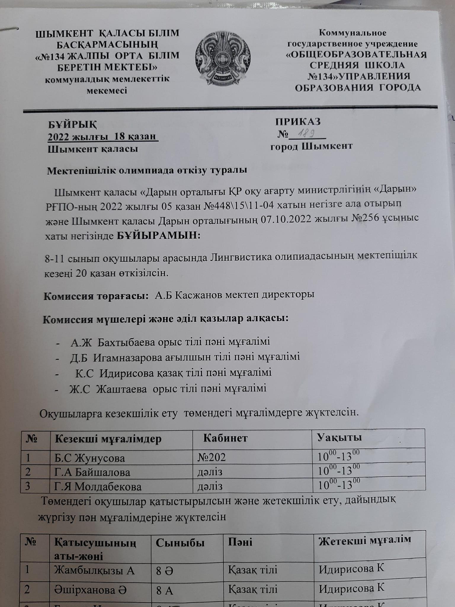 Қазақстан Республикасының Білім және ғылым министрлігінің "Дарын" РҒПО-ның 2022 жылғы 5 қазан №448/15-11-04 хатына сәйкес 20-қазан күні №134 жалпы орта білім беретін мектебінде 8-11 сынып оқушылары арасында Республикалық лингвистикалық олимпиадасының мектепішілік кезеңі өткізілді.