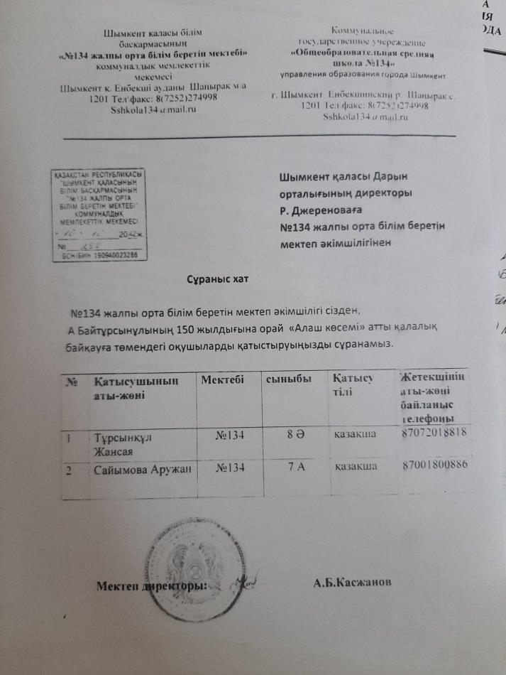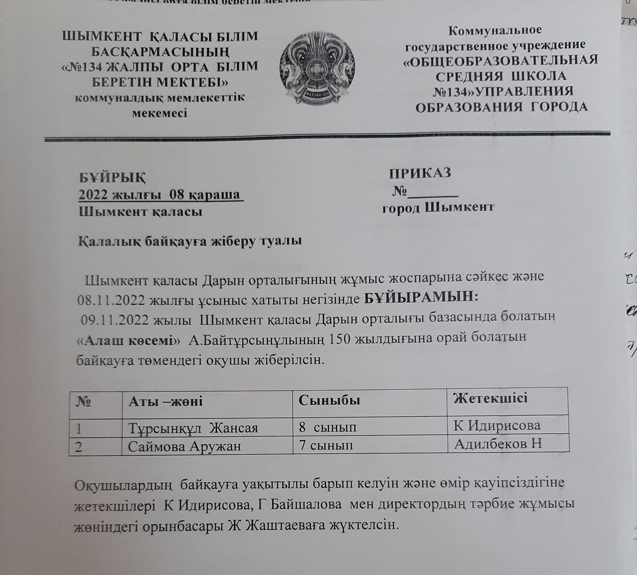 Шымкент қаласы білім басқармасы "Әдістемелік Орталық" Шығыс Қазақстан облысы білім басқармасынан 07.09.2022 жылы №5712 хаты негізінде Дарын орталығының жұмыс жоспарына сәйкес Мемлекет басшысының "Болашаққа бағдар: рухани жаңғыру" атты мақаласындағы қазақтың ақын, әдебиет зерттеуші ғалым, аудармашы, педагог, қоғам қайраткері Ахмет Байтұрсынұлының 150 жылдығына орай 7-8 сынып оқушылары арасында "Алаш көсемі" атты байқаудың қалалық кезеңі 2022 жылдың 9 қарашасында өткізілді.