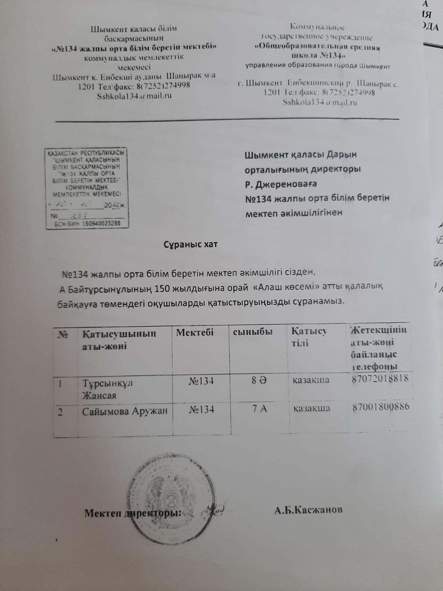 Байқауға 8-сынып оқушысы Тұрсынқұл Жансая мен 7-сынып оқушысы Саймова Аружан қатысты.