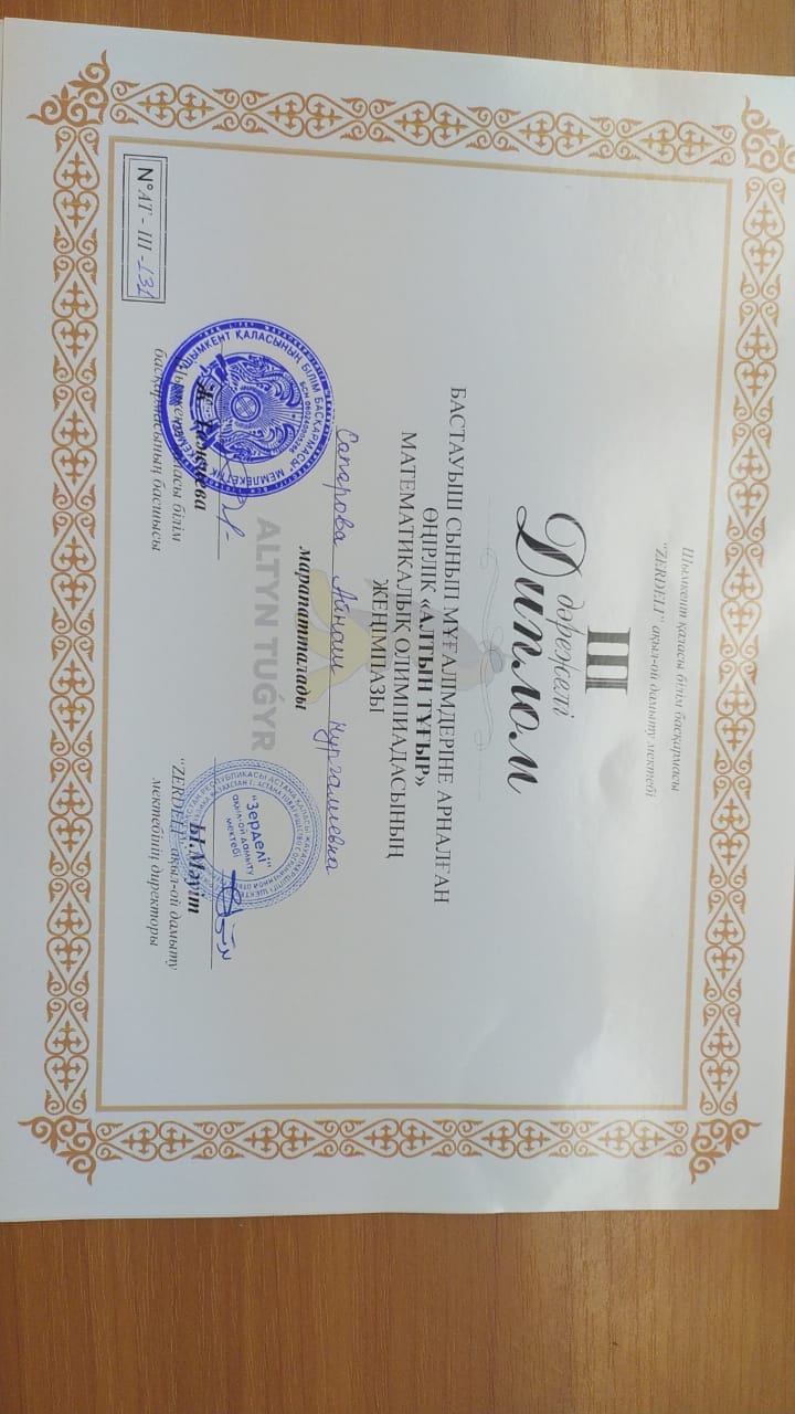 Шымкент қаласы білім басқармасы Әдістемелік орталығы ҚР БжҒМ 2011 жылғы 7-желтоқсандағы №514 бұйрығы және Әдістемелік орталықтың 2022 жылғы 22-қарашадағы №242 ұсыныс хаты негізінде жалпы білім беретін мектептердегі бастауыш сынып мұғалімдері арасында 2022 жылдың 25-қараша күні №52 мектеп-лицейі базасында "Алтын тұғыр" олимпиадасы болып өтті. Олимпиадаға мектебіміздің бастауыш сынып мұғалімі Айнаш Сапарова қатысып, жүлделі ІІІ дәрежелі дипломды иеленді.