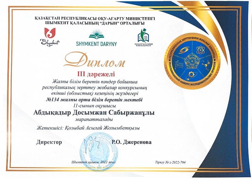 Шымкент қаласының Дарын орталығы КММ, Дарын РҒПО-ның 2022 жылғы 6-желтоқсандағы №1275/15-11-06 хатын негізге ала отырып, жалпы білім беретін пәндер бойынша республикалық зерттеу жобалар конкурсының бірінші кезеңі антиплагиат, екінші (облыстық) кезеңі қорғау бойынша екі оқушымыз қатысып, жүлделі орындарға ие болды. Олар: