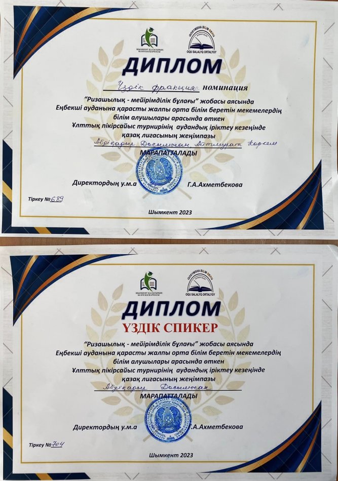 ҮЗДІК ФРАКЦИЯ номинация «Ризашылық-мейірімділік бұлағы» жобасы аясында Еңбекші ауданына қарасты жалпы орта білім беретін мекемелердің білім алушылары арасында өткен Ұлттық пікірсайыс турнирінің аудандық іріктеу кезеңінде қазақ лигасының жеңімпаздары Абдіқадыр Досымжан, Айтмұрат Көркем марапатталып, келесі қалалық кезеңіне өтті. Жеңістерің көп болсын, биік белестерден көріне беріңдер.