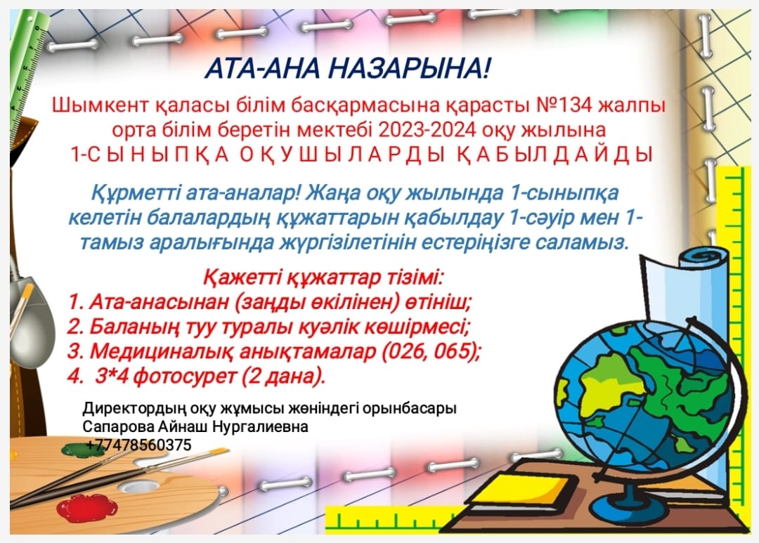 Құрметті ата-аналар жаңа 2023-2024 оқу жылында 1-сыныпқа келетін балалардың құжаттарын қабылдау 1-сәуір мен 1-тамыз аралығында жүргізілетінін естеріңізге саламыз.