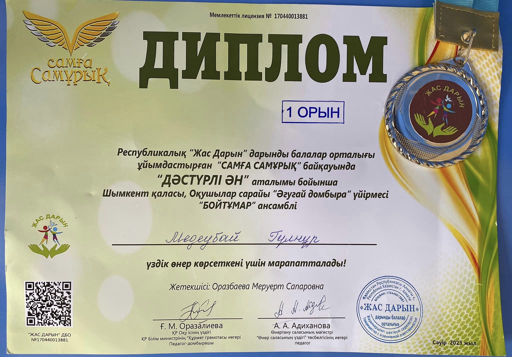 Республикалық “Жас Дарын” дарынды балалар орталығы ұйымдастырған “САМҒА САМҰРЫҚ” байқауында “ДӘСТҮРЛІ ӘН” аталымы бойынша Шымкент қаласы, Оқушылар сарайы “Әгугай домбыра” үйірмесі “БОЙТҰМАР” ансамблі Медеубай Гүлнұр І орын алғаны және үздік өнер көрсеткені үшін дипломмен марапатталды.