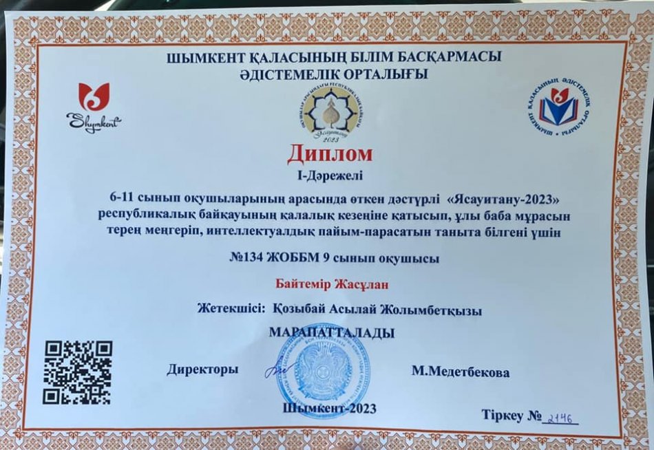 Шымкент қаласы білім басқармасы Әдістемелік орталығының ұйымдастыруымен 6-11 сынып оқушыларының арасында өткен "Яссауитану - 2023" республикалық байқауының қалалық кезеңіне қатысып, ұлы баба мұрасын терең меңгеріп, интеллектуалдық пайым-парасатын таныта білгені үшін І дәрежелі дипломмен мектебіміздің 9-сынып оқушысы Байтемір Жасұлан марапатталды. Жетекшісі Қозыбай Асылай Жолымбетқызы.