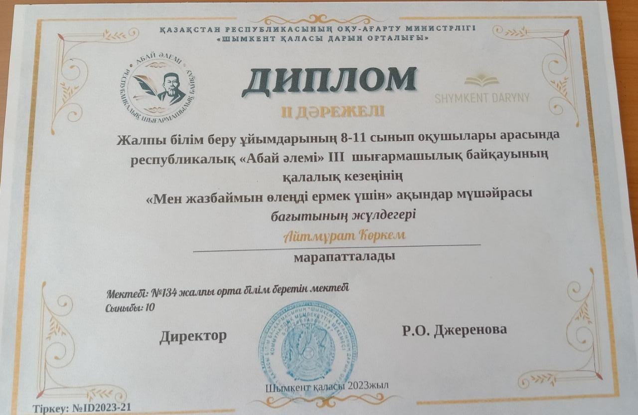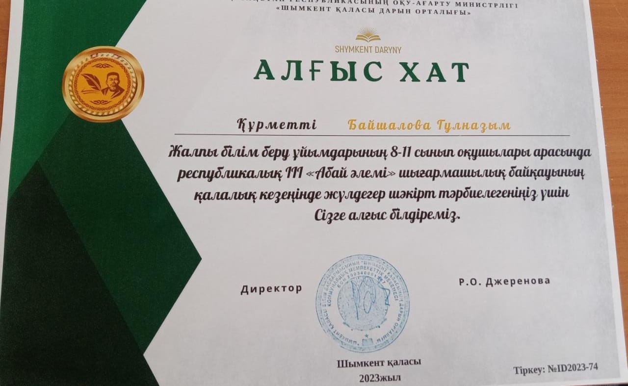 Шымкент қаласы білім басқармасы Дарын орталығы орталығы жалпы білім беру ұйымдарының 8-11 сынып оқушылары арасында өткен республикалық "Абай әлемі" ІІІ шығармашылық байқауының қалалық кезеңінің "Мен жазбаймын өлеңді ермек үшін" ақындар мүшәйрасы бағытының ІІ дәрежелі дипломмен мектебіміздің 11-сынып оқушысы Айтмұрат Көркем Тимурқызы марапатталды. Жетекшісі Байшалова Гүлназым.