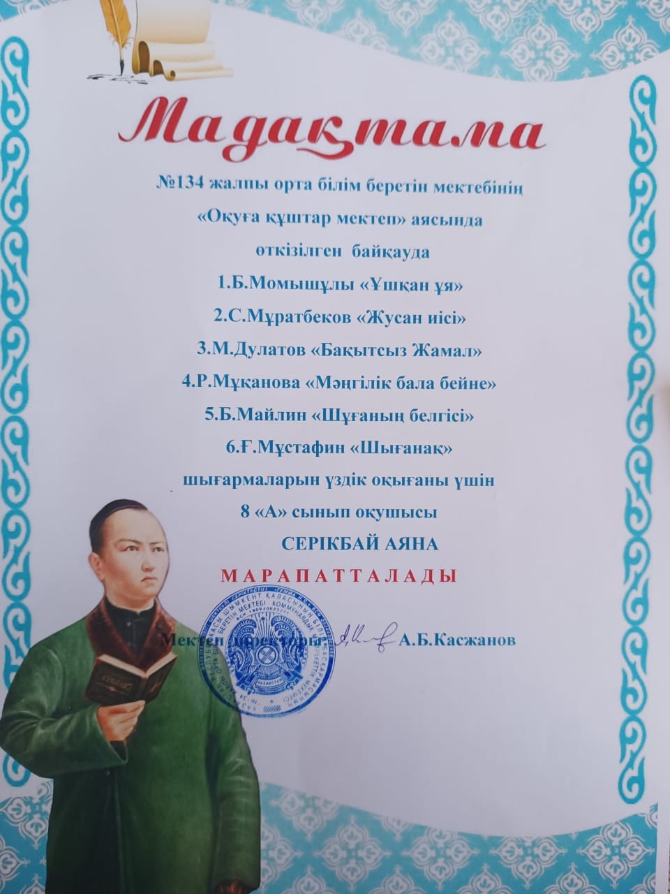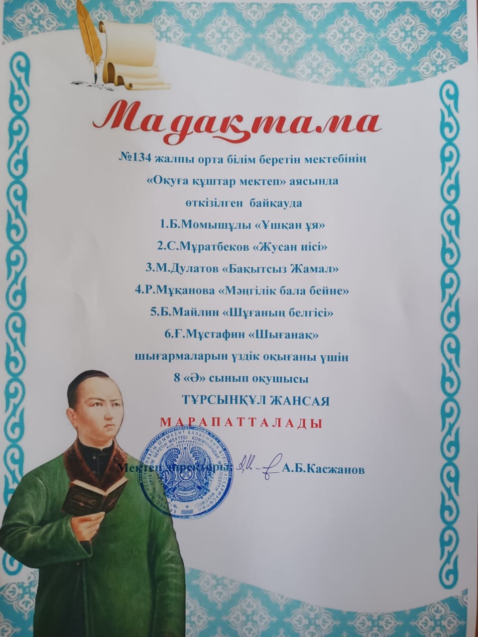 Шымкент қаласы білім басқармасына қарасты №134 жалпы орта білім беретін мектебінде 8-сынып оқушылары арасында "Оқуға құштар мектеп" жобасы аясында Ғ.Мұстафиннің "Шығанақ" шығармасы бойынша байқау өткізілді. Байқау нәтижесі бойынша 8"А"-сынып оқушылары 1-орынды иеленіп, "Үздік оқырман" сынып атанды.