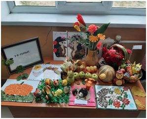 08.10.2021ж күні мектебімізде директордың тәрбие ісі жөніндегі орынбасарлары Жанар Жаштаева мен Лаззат Садибековабасшылығында мектеп тәлімгерлері Балгул Жунусова мен Аяужан Журабекова ұйымдастыруымен 1-8-сыныптар аралығында "БЕРЕКЕЛІ - АЛТЫН КҮЗ" тақырыбында көкөністер мен жемістерден жасалған қолөнер байқауы болып өтті. Байқауға барлық сыныптар белсенді түрдеқатысты. Байқау нәтижесі бойынша: