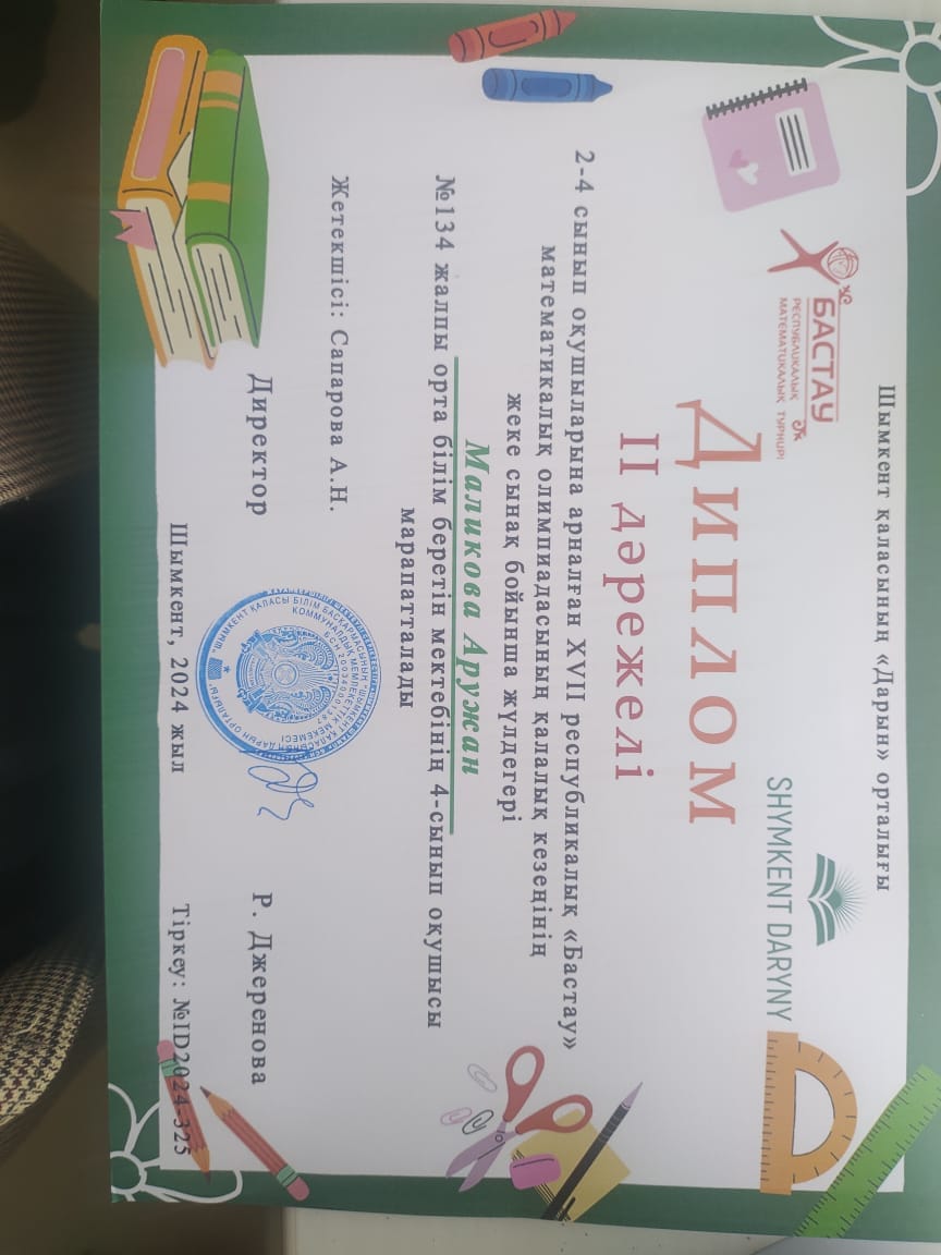 Шымкент қаласы Дарын орталығы ұйымдастырған 2-4сынып оқушыларына XVIIреспубликалық "Бастау"математикалық олимпиадасының қалалық кезеңінің жеке сынақ бойынша жүлдегері №134 жалпы орта білім беретін мектебінің 4"А"-сынып оқушысы