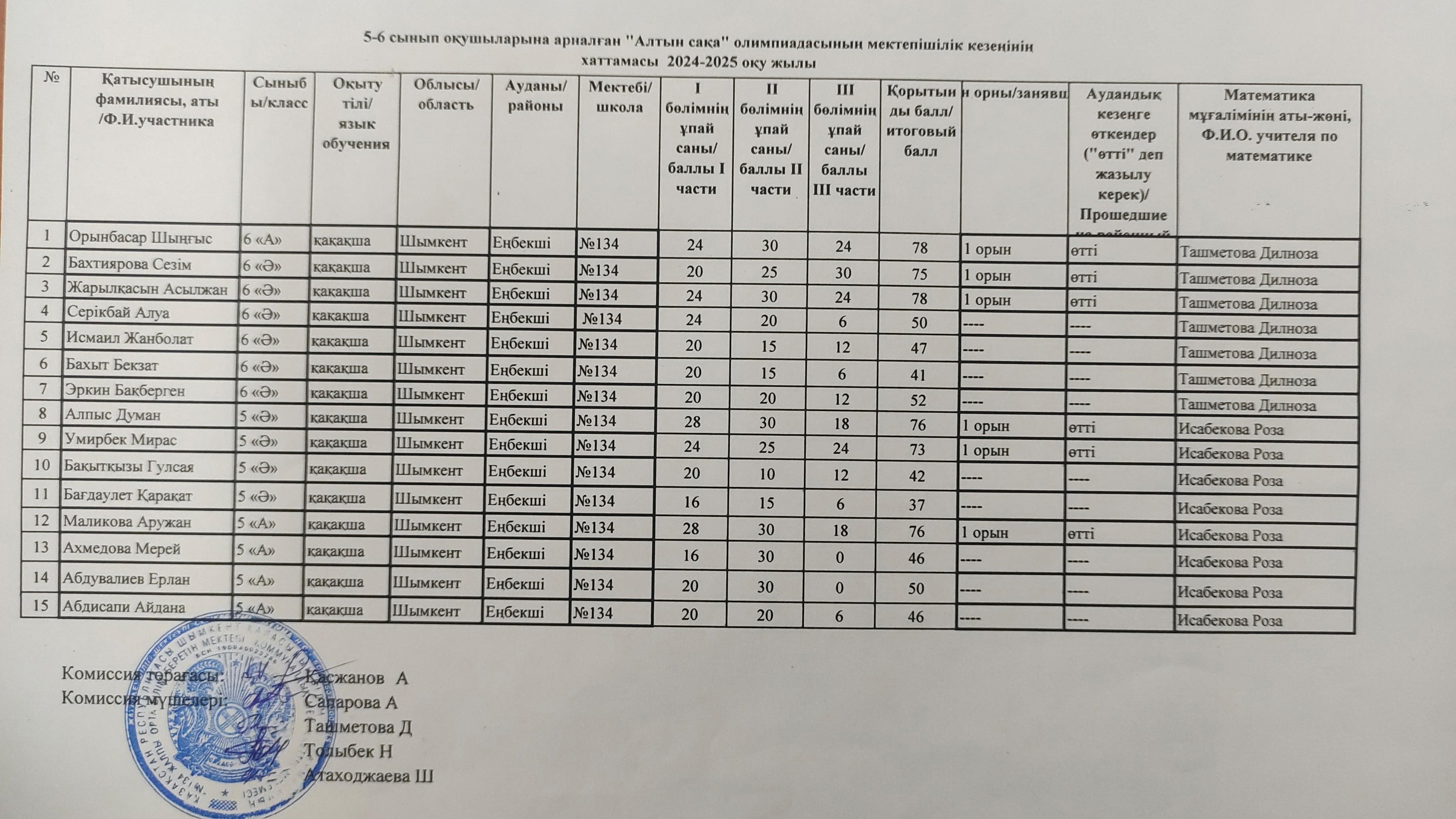 5 сыныптан 8 оқушы, 6 сыныптан 7 оқушы қатысы. Аудандық кезеңге 5 сыныптан 3 оқушы Алпыс Д, Умирбек М, Маликова А,