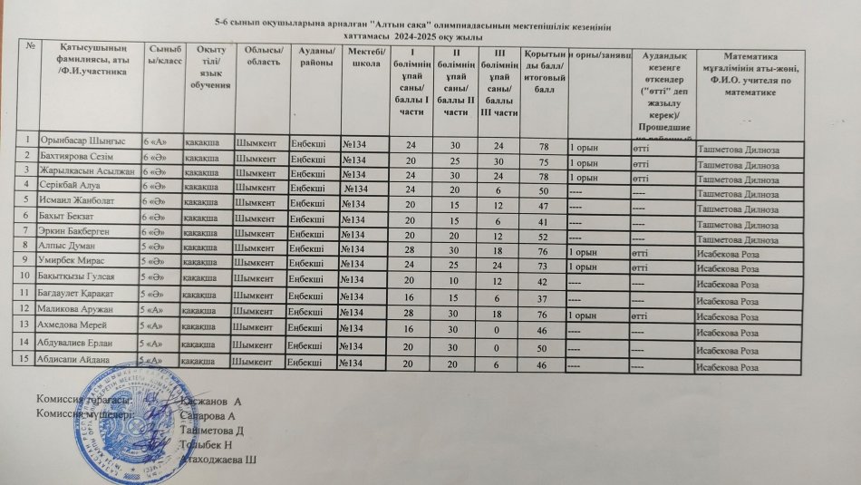 «Шымкент қаласының Дарын орталығы» коммуналдық мемлекеттік мекемесі, «Зерделі» ақыл ой дамыту мектебінің 2024 жылғы 23 қыркүйектегі №227-хатына сәйкес 3-4 және 5-6 сынып оқушыларына арналған математикадан республикалық « Алтын сақа» олимпиадасының мектепішілік кезеңі өтті,