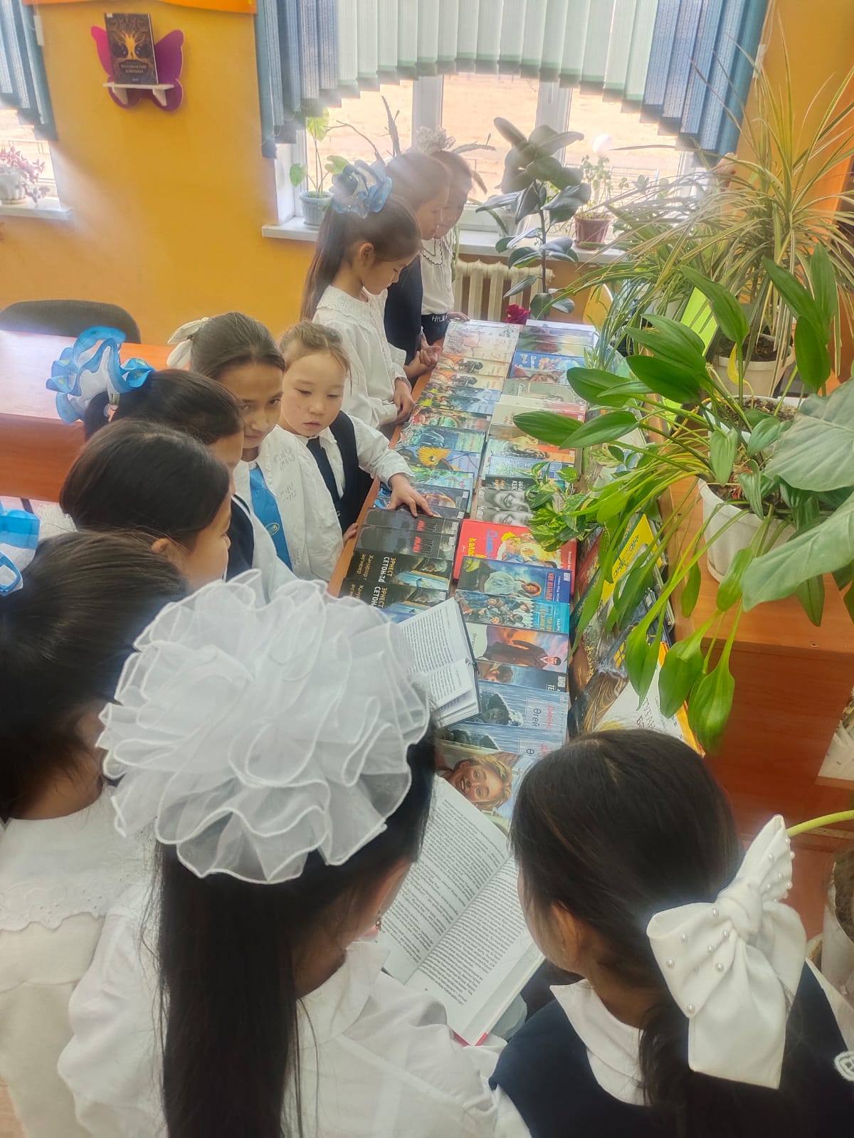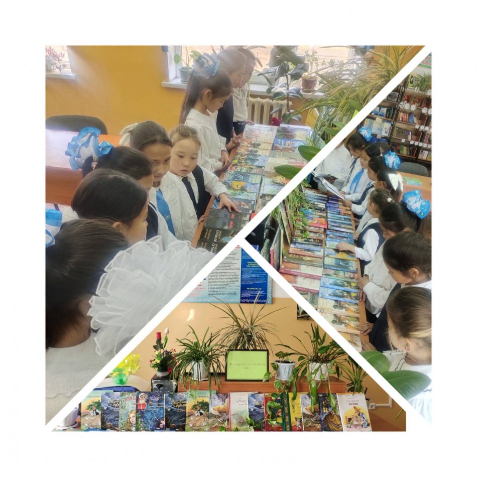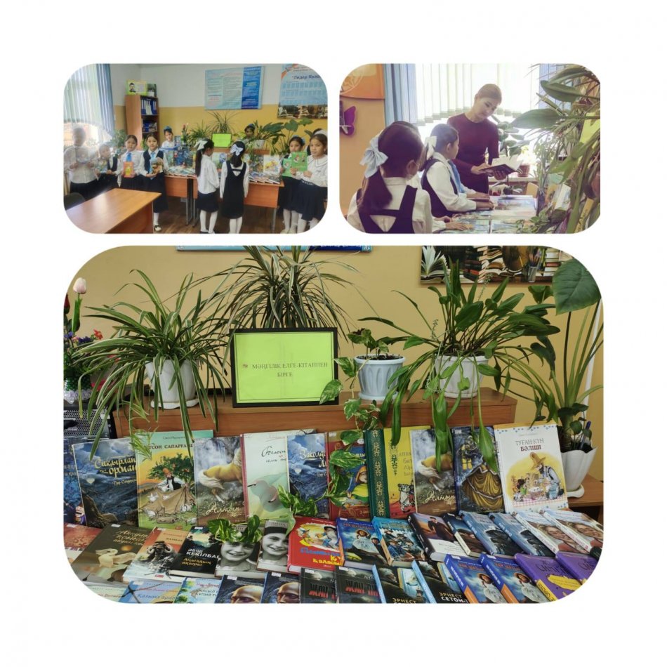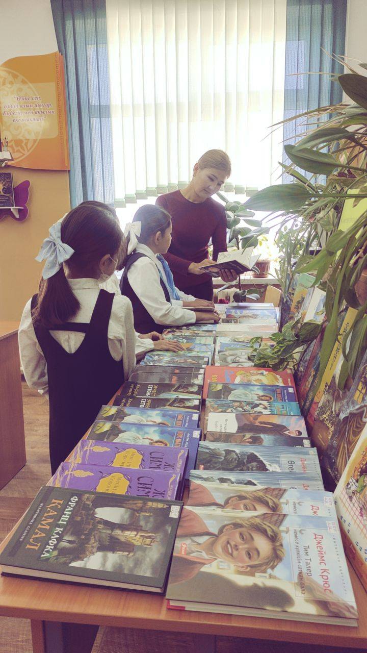 Жаңа әдебиеттерді оқырмандарға таныстыру, насихаттау мақсатында «Біз кітап арқылы бастауыш мектептің өзінде-ақ бүкіл адамзат өмірімен танысамыз. Кітап білімімізді молайтады, кітаптан көп үлгі-өнеге мен тәрбие аламыз» деп кітапхана меңгерушісі Э.К.Байбекова оқушыларға кітапхана қорындағы көрмеге қойылған көркем әдебиетпен таныстырып шықты.