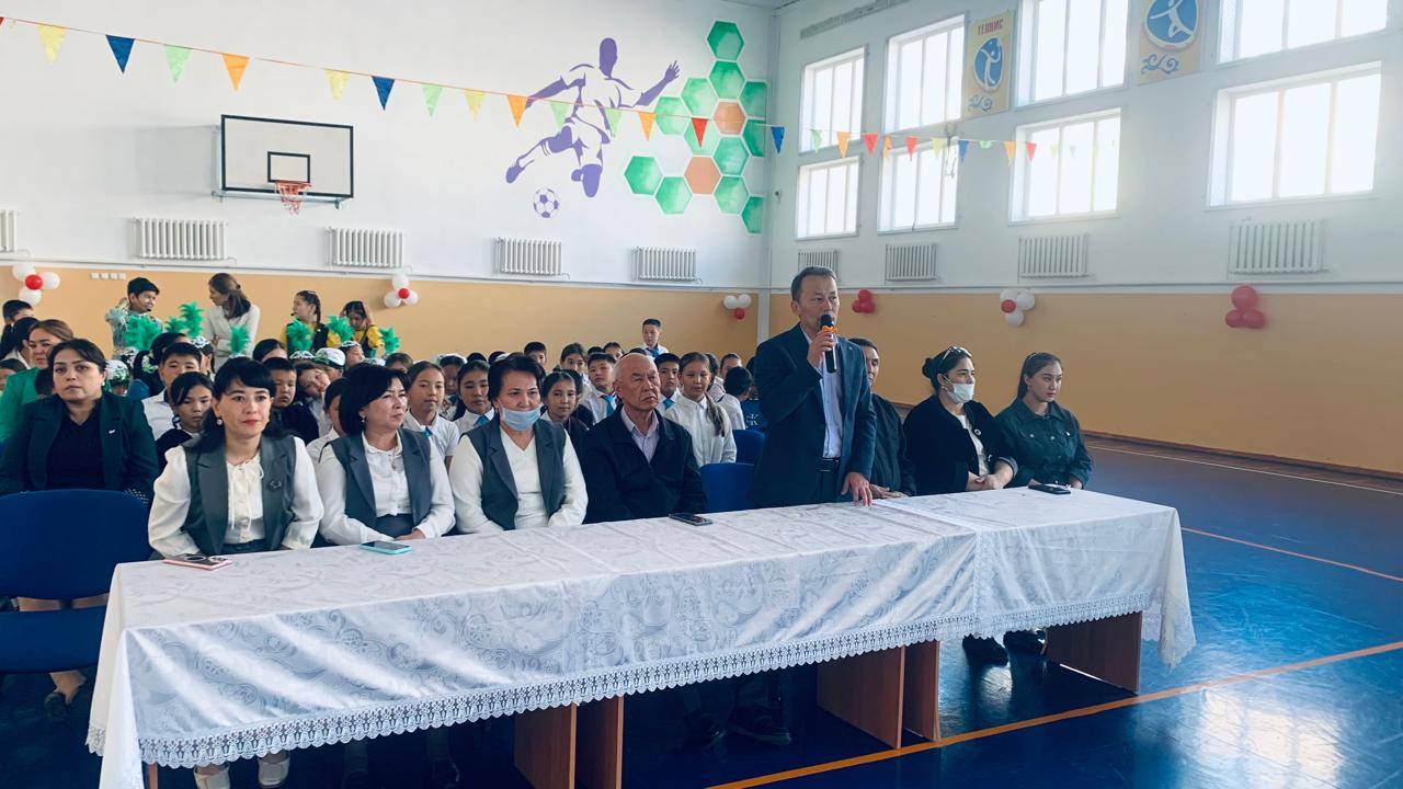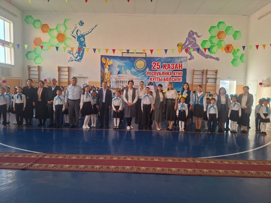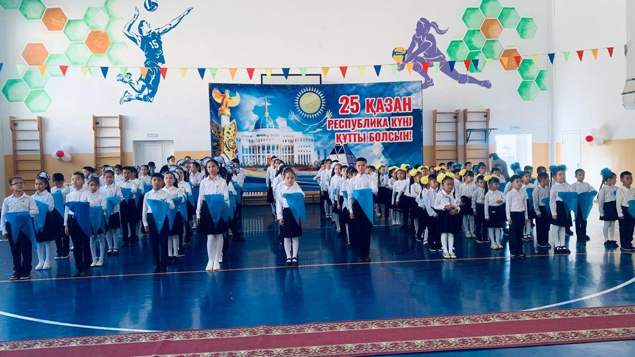 Жиында «Жас ұлан» ұйымының әнұраны шырқалды. Туымыз түстес галстук табыстау рәсімі мектеп директорына, мектеп әкімшілігі мен ұстаздарға тапсырылды. Оқушылардың патриоттық сезімін ояту мақсатында әндер орындалып, мың бұралып бишілер би-биледі. Салтанатты жиын тәрбие орынбасарлары Ж.С. Жаштаева, Л.О.Садибекованың ұйымдастыруымен тәлімгер К.Аренова өткізді.