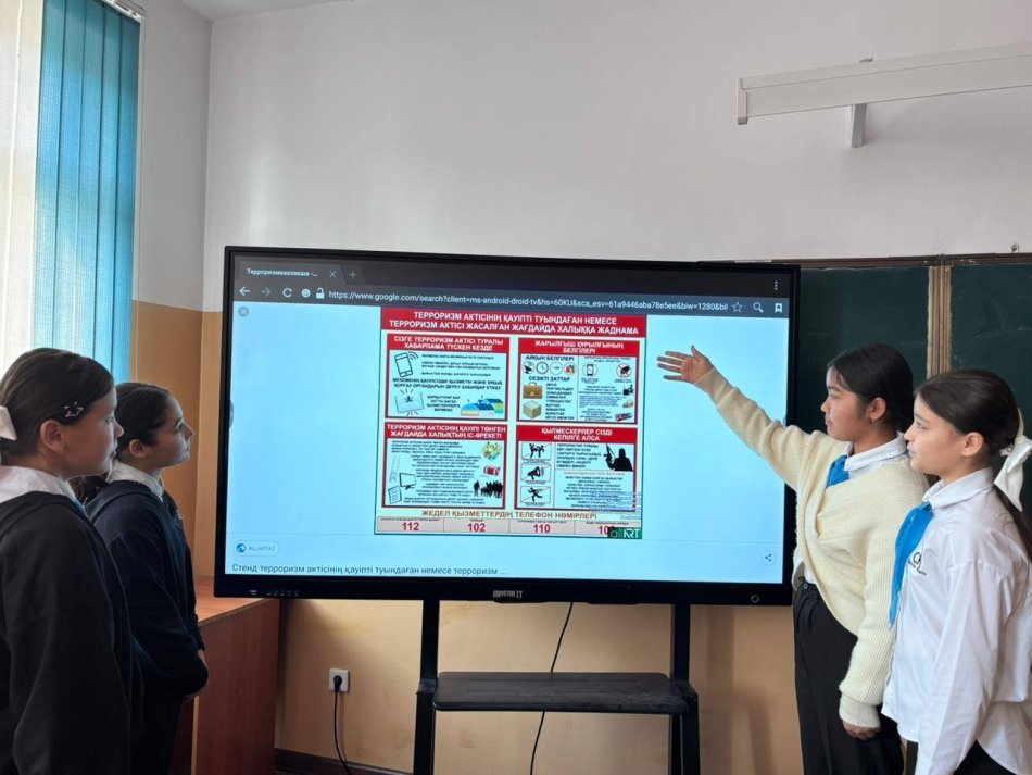 Терроризм – бүкіл әлемге ортақ қауіп. Әрбір азамат, әр оқушы – қауіпсіздікке жауапты. Ең бастысы – *сақ болу, сезіктіні байқап, дер кезінде хабар беру*.