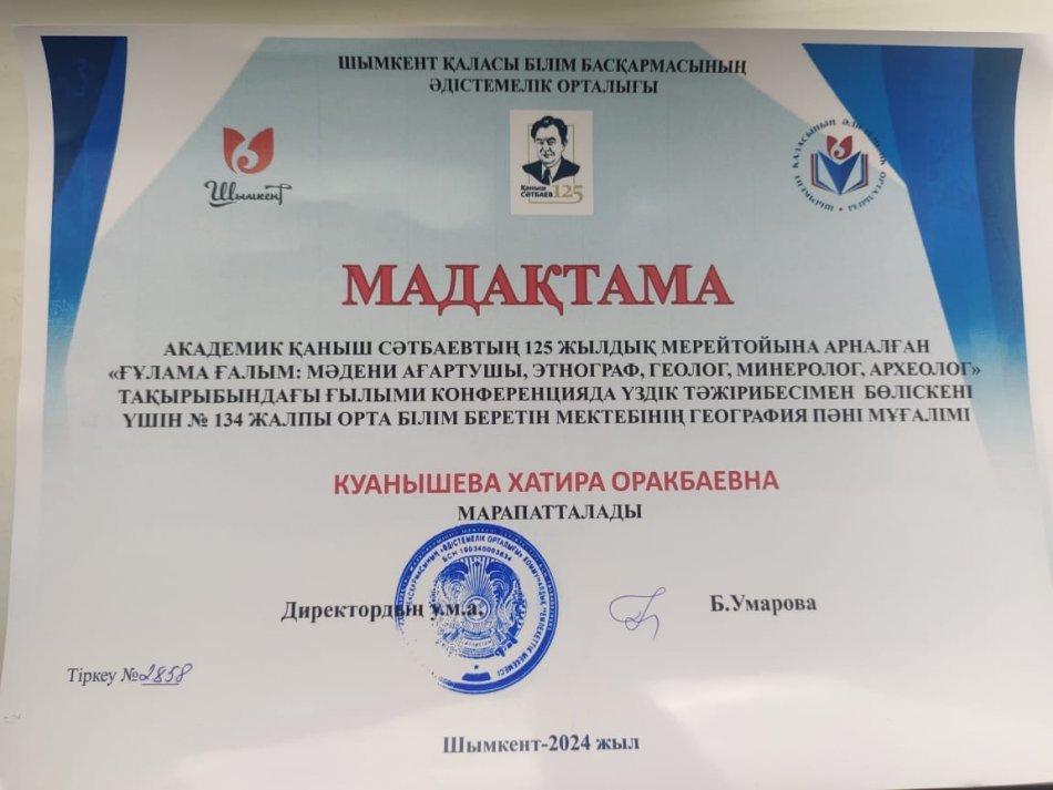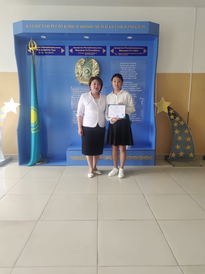 ЕЛАМАН ЖАСМИН I- дәрежелі диплом КУАНЫШОВА ХАТИРА мадақтамамен марапатталды.