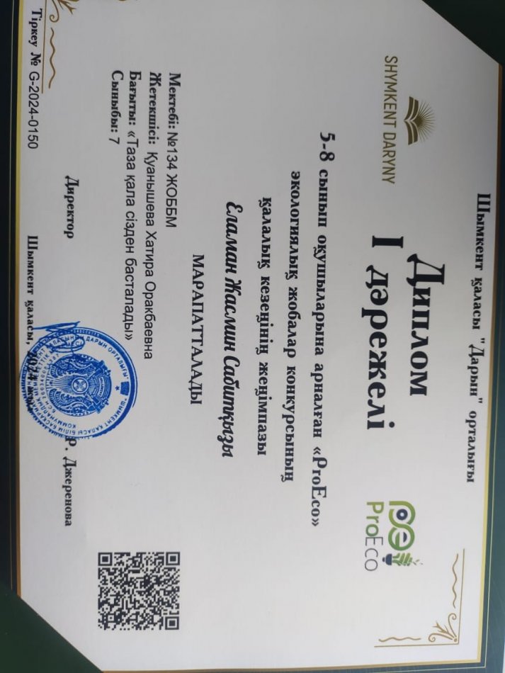 Шымкент қаласы Дарын орталығы ұйымдастырған 5-8сынып оқушыларына арналған "Pro Eco" экологиялық жобалар конкурсының қалалық кезеңінің жеңіпазы 7 "А"сынып оқушысы