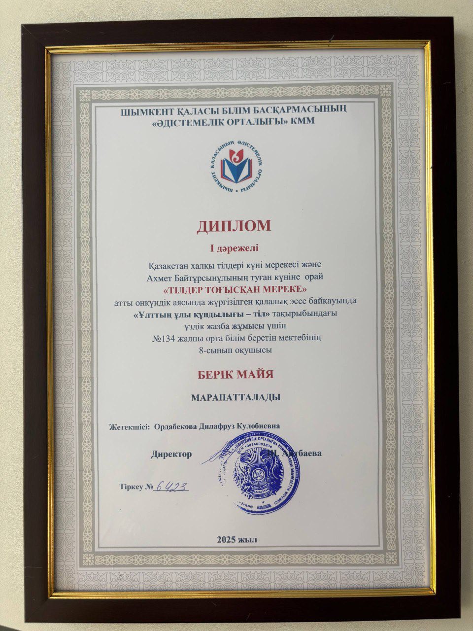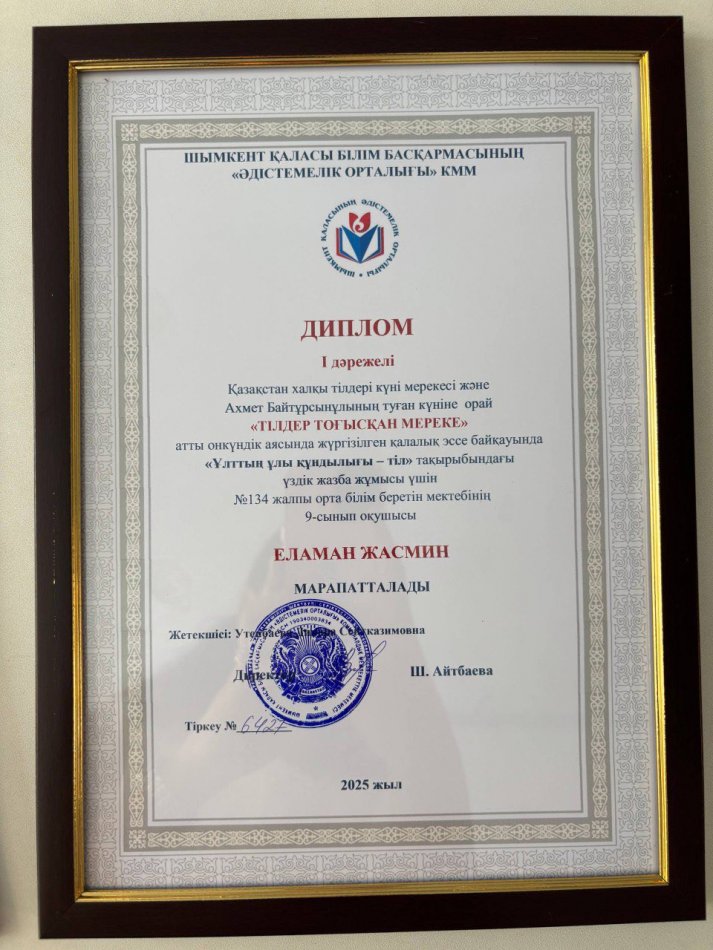 Шымкент қаласы Әдістемелік орталығының жылдық жұмыс жоспары негізінде, "5 қыркүйек - Қазақстан халқы тілдері күні" мерекесі қарсаңында Ахмет Байтұрсынұлының рухани мұрасын насихаттау арқылы мемлекеттік тілдің мәртебесін арттыру, этносаралық келісімді, патриотизм мен мәдени тұтастықты нығайту мақсатында,2025 жылдың 3 қыркүйек күні 8-10 сыныптар арасында "Ұлттың ұлы құндылығы - тіл" атты қалалық эссе байқауына оқушыларымыз қатысып І дәрежелі дипломмен марапатталды. Берік Мая 8 "Б" сынып оқушысы. Жетекшісі: Ордабекова Дилафруз Кулобиевна. 9 "А" сынып оқушысы Еламан Жасмин. Жетекшісі: Утенбаева Динара Сейтказимовна! Марапаттарыңыз құтты болсын!