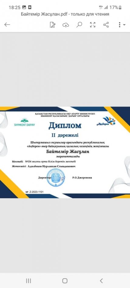Шымкент каласы Дарын орталығының 2023 жыл 26қазандағы √401ұсыныс хаты негізінде "Ақберен" байқауының қалалық кезеңіне мектебіміздің окушылары қатысты. Қазбекова Әсел эссе жазудан Байтемір Жасұлан ұлттық аспапта өнер көрсетті. Тұрсынқұл Жансая Шешендік білгірлік осындай бағыттарда байқауға қатысты. Байқау нәтижесінде Байтемір Жасұлан 2-орын, Тұрсынқұл Жансая 3-орын иеленіп сыйлықтармен марапатталды.