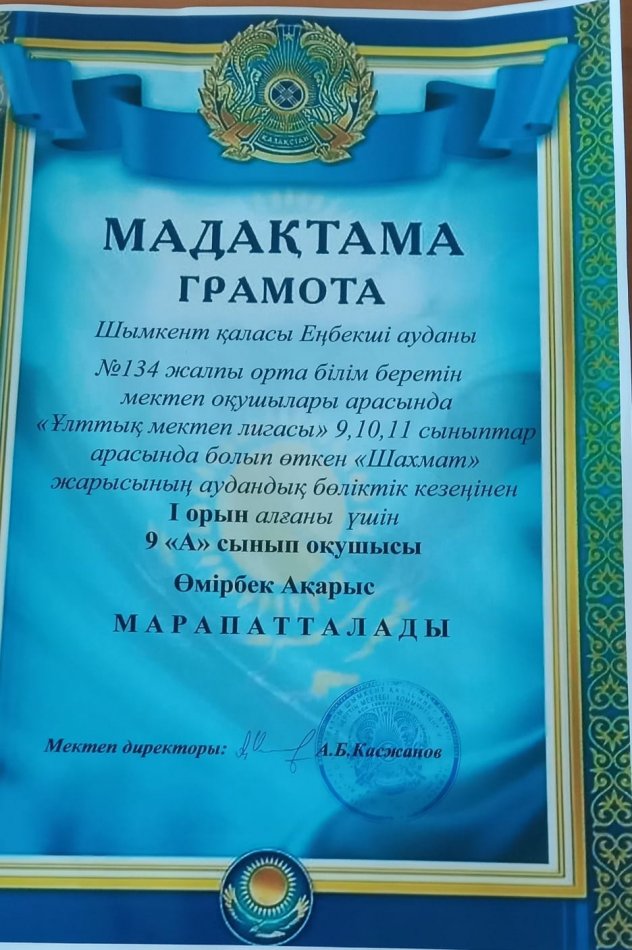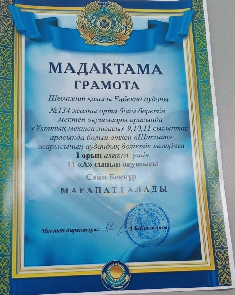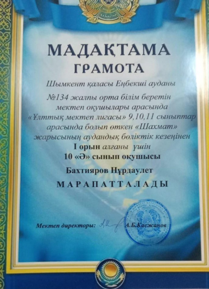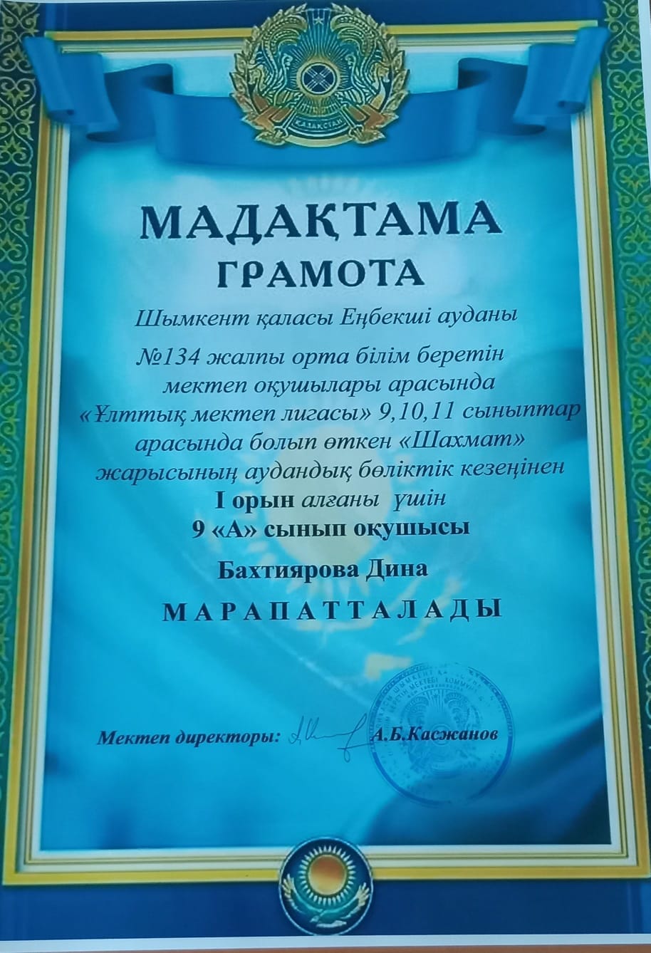 Шымкент қаласы Еңбекші ауданы №134 жалпы орта білім беретін мектеп оқушылары арасында "Ұлттық мектеп лигасы "9,10,11 сыныптар арасында болып өткен "Шахмат "жарысының аудандық бөліктік кезеңінен, 1 орын алғаны үшін 9"А"сынып оқушысы Бахтиярова Дина,