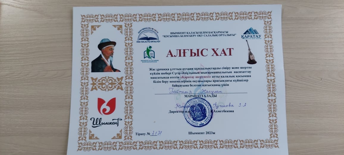 Шымкент қаласы білім басқармасы "Қосымша білім беру оқу салалық орталығы"ұйымдастырған жас ұрпаққа ұлттық-рухани құндылықтарды сіңіру және шертпе күйдің шебері Сүгір Әліұлының шығармашылығын насихаттау мақсатында өткен"Қаратау шертпесі" атты қалалық білім беру мекемелерінің оқушылар арасында күйшілер байқауына қатысып, белсенділік танытқаны үшін Байтемір Жасұлан алғыс хатпен марапатталады.