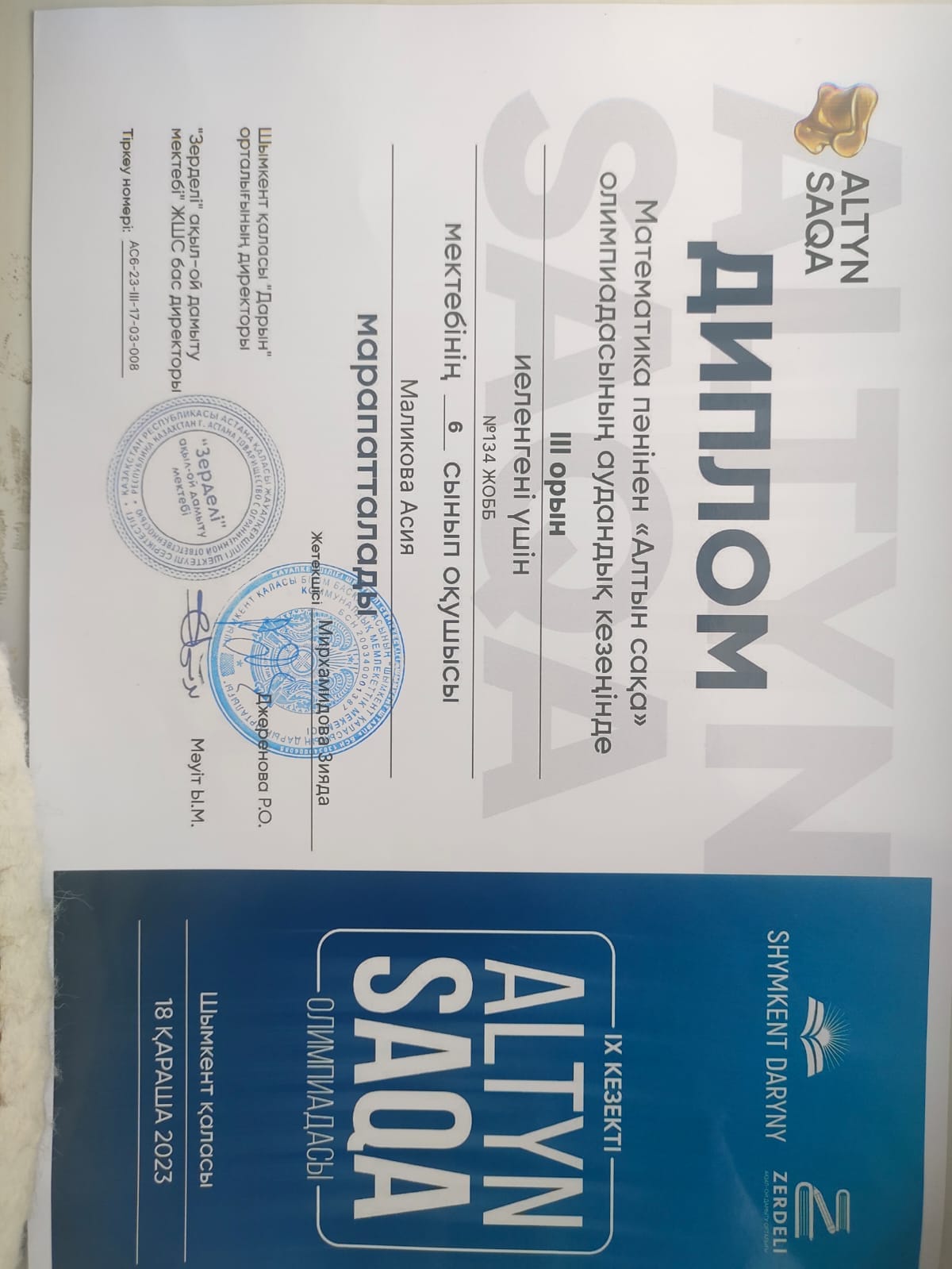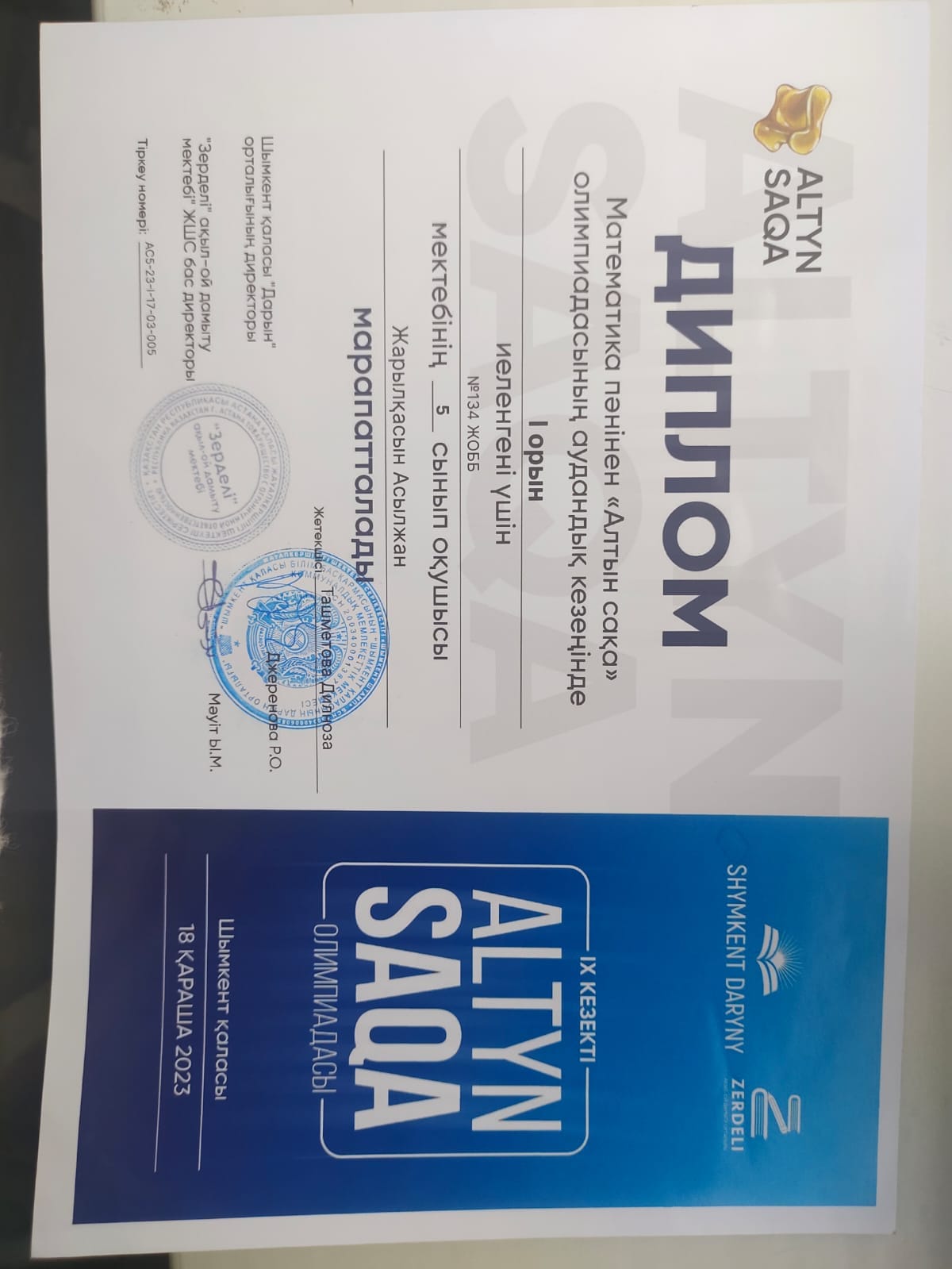 Шымкент қаласы Дарын орталығы КММ жылдық жоспарына сәйкес, "Зерделі ақыл -ой дамыту орталығымен бірлесе отырып, 5-6 сынып оқушылары арасында математика пәнінен "Алтын сақа"республикалық олимпиадасының аудандық кезеңі санитарлық эпидемиологиялық нормаларды сақтай отырып А.Навои атындағы √11мектеп пен С. Нұрмағанбетов атындағы √72 мектепте болды. Олимпиадаға мектебімізден 6-сынып оқушысы Маликова Асия мен 5-сынып оқушысы Жарылқасын Асылжан қатысты. Нәтижесінде Маликова Асия III-орын иеленді. Жарылқасын Асылжан I-орын алды. Жеңістерің құтты болсын. Әрқашан биік шыңнан көріне беріңдер дейміз.