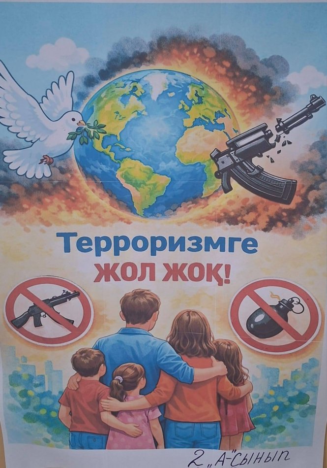 Шымкент қаласы №134 жалпы орта білім беретін мектебінде 2026 жылдың 19–23 қаңтар күндері аралығында 1–11 сынып оқушыларының қатысуымен «Терроризмге жол жоқ» тақырыбында сурет байқауы ұйымдастырылды.