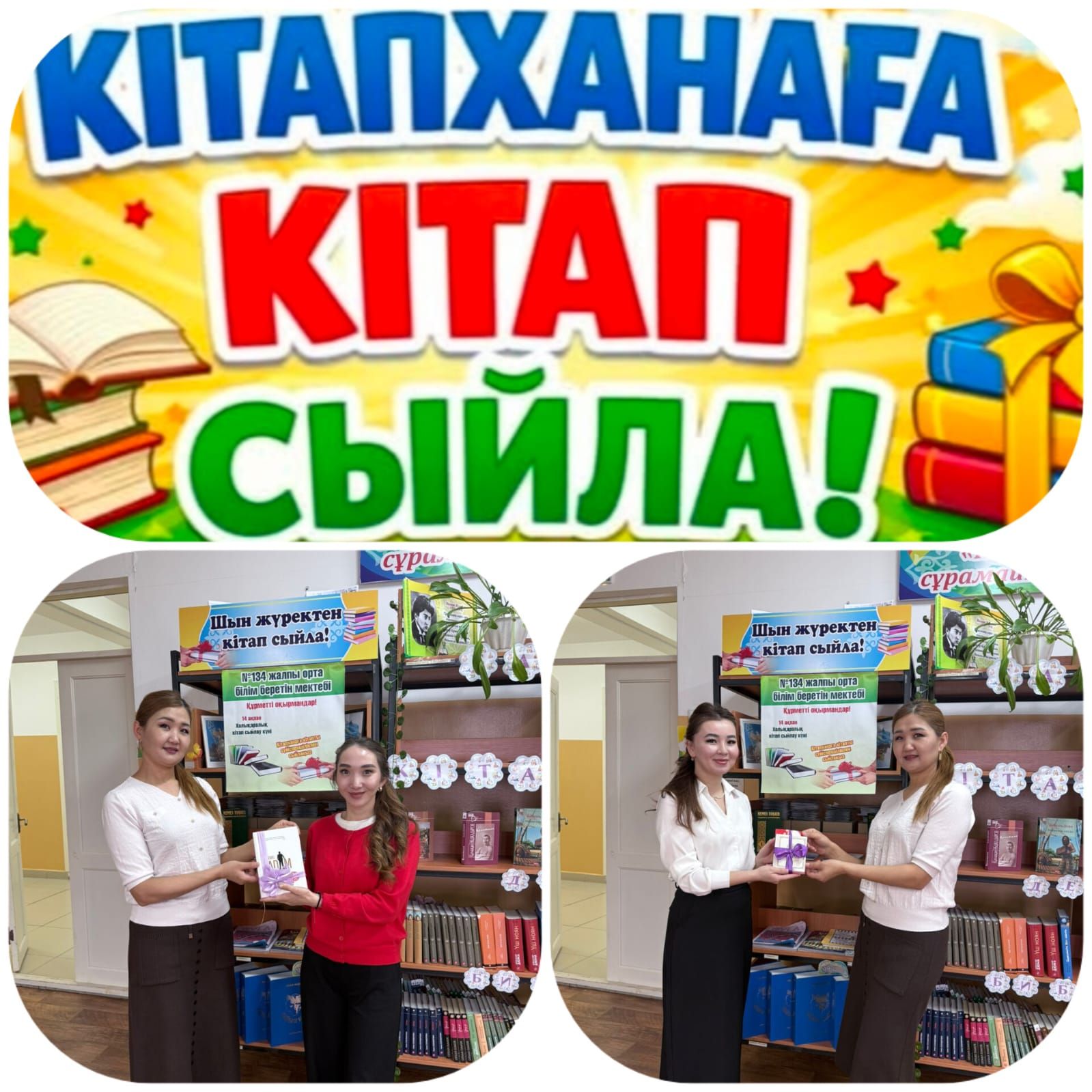 Шымкент қаласы №134 жалпы орта білім беретін мектебінде «Балалар кітапханасы» бағдарламасы аясында 14 ақпан Халықаралық кітап сыйлау күніне орай «Шын жүректен кітап сыйла!» акция-челленджі жарияланып, мектеп кітапханасының қоры заманауи басылымдармен толықтырылып жатыр.
