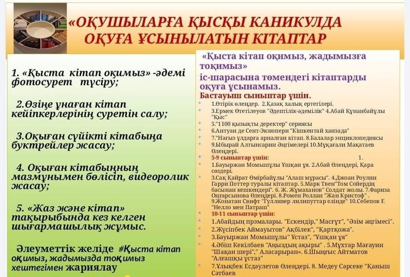 "Қыста кітап оқимыз, жадымызға тоқимыз!" акциясы шеңберінде қысқы каникулда Қазақстан Республикасы бойынша сыныптарға ұсынылған кітаптар тізімі: